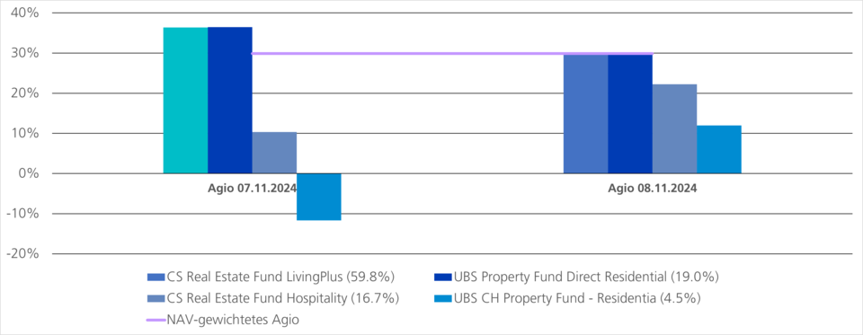 Am 8. November 2024, einen Tag nach der Bekanntgabe der Fusion, kam es zu stärkeren Kursreaktionen bei den betroffenen Immobilienfonds. So ging der Immobilienfonds Residentia mit einem Plus von 26,8% aus dem Handel. Die drei weiteren Fonds, die mit Residentia zusammengelegt werden, reagierten unter­schiedlich: Während die beiden Fonds CS REF LivingPlus (-4,6%) und UBS Direct Residential (-5,1%) unter Druck gerieten, stieg der CS REF Hospitality um 10,8% an.